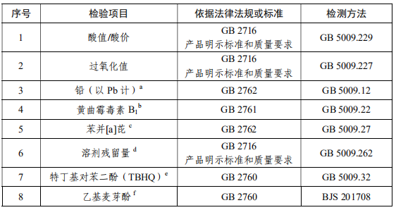 GB 2716 食品安全國家標準 植物油 GB 2760 食品安全國家標準 食品添加劑使用標準 GB 2761 食品安全國家標準 食品中真菌毒素限量 GB 2762 食品安全國家標準 食品中污染物限量 GB 5009.12 食品安全國家標準 食品中鉛的測定 GB 5009.22 食品安全國家標準 食品中黃曲霉毒素 B 族和 G 族的測定 GB 5009.27 食品安全國家標準 食品中苯并(a)芘的測定 GB 5009.32 食品安全國家標準 食品中 9 種抗氧化劑的測定 GB 5009.202 食品安全國家標準 食用油中極性組分(PC)的測定 GB 5009.227 食品安全國家標準 食品中過氧化值的測定 GB 5009.229 食品安全國家標準 食品中酸價的測定 GB 5009.262 食品安全國家標準 食品中溶劑殘留量的測定 BJS 201708 食用植物油中乙基麥芽酚的測定 GB/T 1534 花生油 GB/T 1535 大豆油 GB/T 1536 菜籽油 GB/T 1537 棉籽油 GB/T 8233 芝麻油 GB/T 8235 亞麻籽油 GB/T 10464 葵花籽油 GB/T 11765 油茶籽油 GB/T 15680 棕櫚油 GB/T 18009 棕櫚仁油